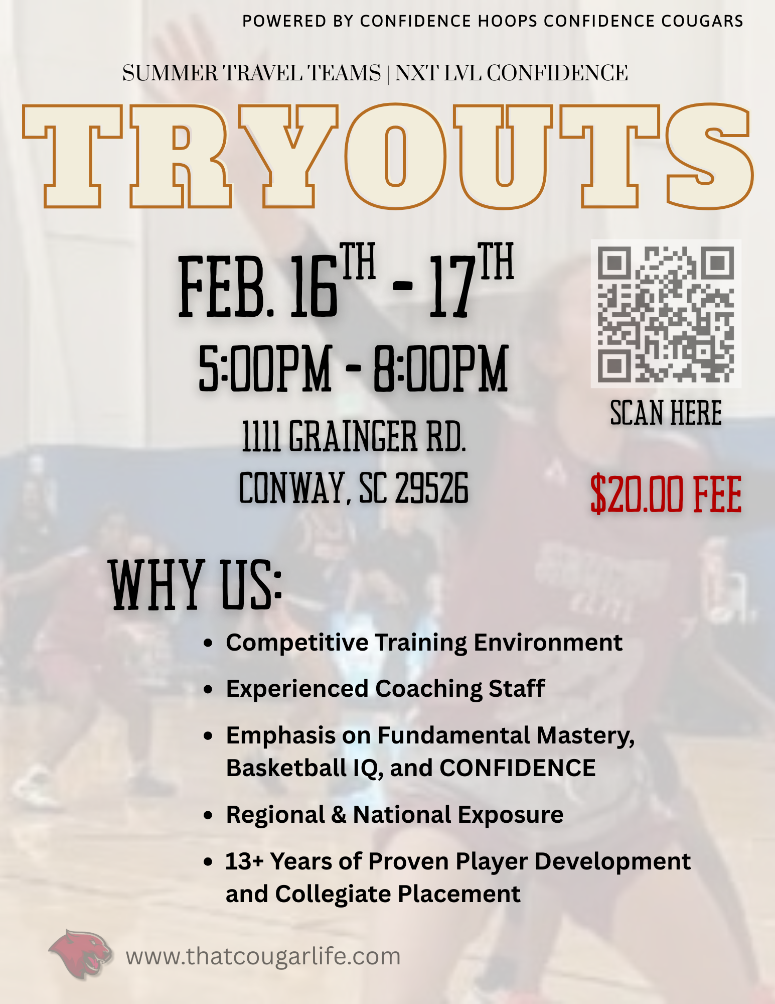 Based in Horry County, Confidence Hoops Confidence Cougars (CHCC) is a premier competitive travel basketball program dedicated to developing well-rounded athletes through elite training, fundamental skill mastery, and advanced basketball IQ. Our program emphasizes teamwork, discipline, and sportsmanship while competing in top-tier tournaments, including Inside Exposure, Ohio Basketball, Select Events, ASGR, NTBA, and USS.